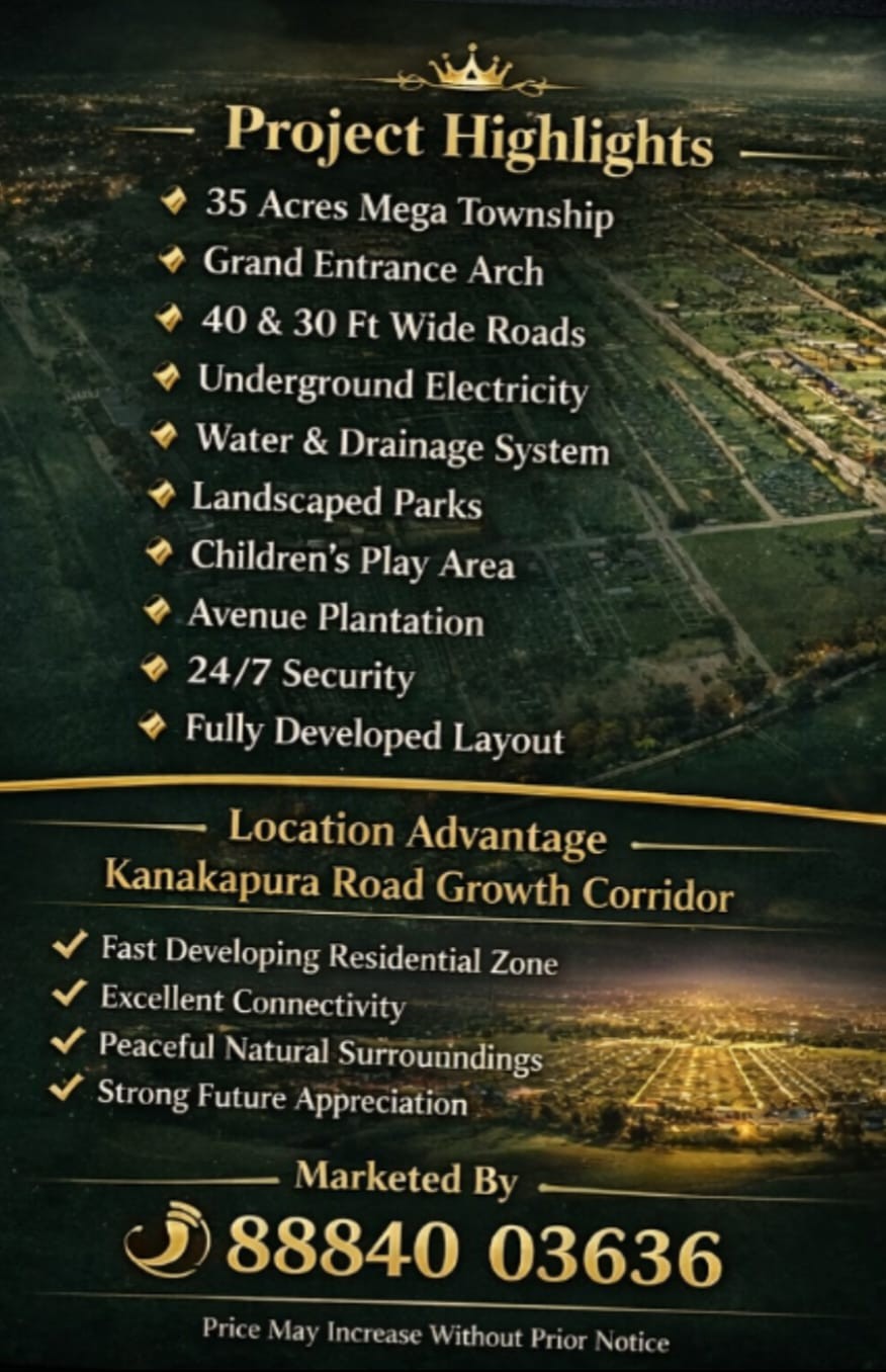 A New BMRDA 35 acre Township Project is Born near Kanakpura – Sathanur, Offering plots @ Rs. 1499/sqft (Pre Launch Price) Individual E Katha Done – Bank Loans available, a Lifetime Clubhouse membership, Limited Offer for First 25 Plots Only , Hurry Up